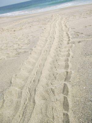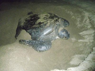 | Et bien la voila en train de pondre 148 oeufs! Rien que ca! C'est tres impressionnant a voir. Le monsieur qui s occupe des tortues du parc, lui pique les oeufs pour les faire eclore a l abri des predateurs. Ensuite elle rebouche le trou qu elle a fait pour ces oeufs et repart lentement vers la mer. ca va pas vite ces choses la (150 kg rempant sur le sable, il faut se les trainer!) |