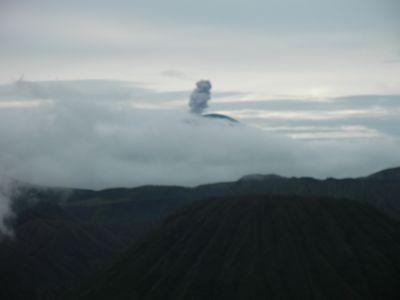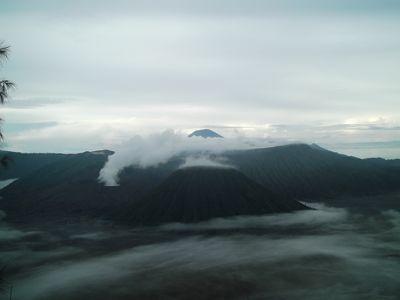 | Derriere les trois volcans, on voit le point culminant de l ile qui est en fait le volcan le plus actif de l ile. Le Semeru crache de la fumee toute les demi heure!!! |
