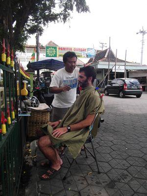 | Arrives a Jogjakarta (Petite ville au milieu de l ile de Java), Vincent de retour a la civilisation a decide de se refaire une beaute. 1 euro la coupe et le rasage a sec (Aie!) pas cher! Mariane tu as de la concurrence ici! Une chaise dans la rue, un rasoir, des ciseaux, ca suffit ici pour monter un salon de coiffure. |