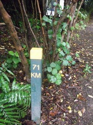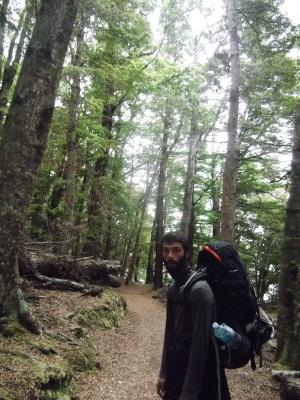 | Le premier jour nous avions 27 km a faire. On avait pris nos gros sacs a dos et il pleuvait. Ca a ete dur dur... On a quand meme vu de belles forets et des "Weka" cet oiseau qui ne vole pas et qui ressemble au "Kiwi". C'est pas du tout peureux et ca aime bien piquer la bouffe du pic nic! |