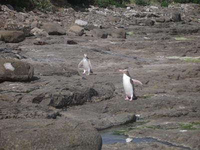 | On a ensuite ete se promener le long de la cote et on a vu des"penguins a yeux jaunes". Et oui il y a des penguins en Nouvelle Zelande. Il faut dire qu ils sont pas tres loin du pole sud ici. C'est tres marrant comme animal surtout quand ca se deplace et quand ca crit. Les penguins ont un cris tres... orgasmique! |