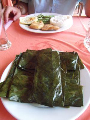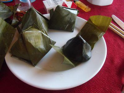 | Parlons peu, parlons bien, parlons bouffe! Ici comme on vous le disait, la nourriture est un vrai regal! Je m amuse a tester les specialites locales et par ici je me retrouve souvent avec de la nourritue envelopee dans de grandes feuilles vertes. Des sortes de paquets surprises, c'est assez marrant mais l interieur toujours excellent. Vincent lui il mange du riz, des bananes et pas trop de plantes... (C'est pas un Renaudin pour rien!...) |
