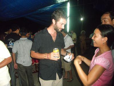 | Le soir il y avait une petite fete au village. On etait les seuls blancs et ont a ete un peu "l'attraction" de la soiree. Tout le monde nous offrait des bieres. Il fallait trinquer a chaque fois que l'on buvait (tu aurais ete tres heureux papa!) et on devait boire entierement ou la moitie de la biere a chaque fois. Autant dire que apres une heure, on avait bu quelques bieres!! Il y avait aussi un micro avec une sono ou les villageois chantaient a tour de role. Apres avoir ete soliciter par les villageois, on a finalement chante "les champs elysees". C etait pas top mais au moins on a participer! On a passe une super soiree! |