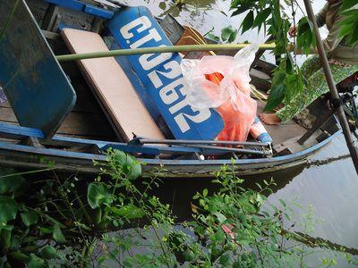| Mais tout etait trop beau pour etre vrai. C'etait bien trop facile cette petite matinee organisee sans embuche. Alors il faut qu'on vous explique... Il y a beaucoup de bateaux sur le Mekong surtout aux alentours des villes et des marches. On a vu un gros bateau droit devant. On allait clairement droit sur lui. Pensant que notre guide allait tourner nous n'avons rien ose dire. Jusqu'a ce qu on arrive a quelques metres du bateau. La on a prevenu la guide qui a aussitot braquee (Comme elle etait assise derriere nous et non debout elle n'a pas vu le gros bateau arrive). Malheureusement c'etait trop tard et on a heurte le bateau de cote. On a bien cru qu' on allait tous finir a l'eau mais la barque a tenue le choc (Meme si on a bien tangue quand meme). Il y a eu plus de peur que de mal. Vous pouvez voir sur la photo que le bateau a quand meme pris un bon choc : une belle fissure!