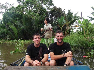 | On a ensuite ete se perdre dans les petits canaux du Mekong. Vous pouvez voir les deux frangins qui ont l'air bien heureux tous les deux (C'est pour moi que c'est difficile maintenant : je n'ai plus mon mot a dire face aux frangins!...). Vous pouvez voir ue notre guide est debout a l arriere en train de piloter. A c'est sur elle s'est plus jamais rassis apres le choc avec l autre bateau! Bon mais elle regarde pas droit devant quand meme : c'etait pas une grande experte nautique! |