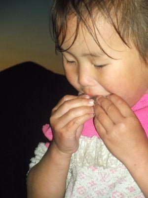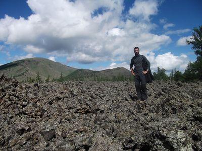 Le premier lac que nous rencontrons en Mongolie centrale est un lac naturel qui a ete forme par l erruption d un volcan dont la lave a bloque la riviere. L eau n est pas tres chaude mais ca nous permet quand meme de nous laver sommairement. C est ici qu on a appri la naissance de Mel . On l a fete le soir avec des francais rencontres dans le camp ou l on dormait et une hollandaise qui avait traverser le desert de Gobi a pied!