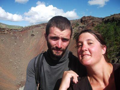 Enfin arrive en haut on est contents et impressionnes de voir le cratere. Enfin, Vincent tire un peu la tronche sur la photo mais c est juste a cause du soleil !