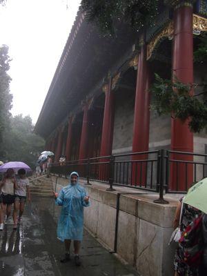 | Le lendemain on est partis visiter le palais d'ete de Pekin. Nous avons bien sur fait les "vrais" touristes et pris un pousse pousse pour nous y rendre (il faut dire qu il pleuvait des cordes et que ca nous arrangeait bien!). Bon, le pousse pousse aujourd'hui ca a bien change! Le conducteur n est plus a pieds mais en velo et meme en velo electrique voir en mobilette : c'est plus si difficile d'etre conducteur de pousse pousse en Chine. |