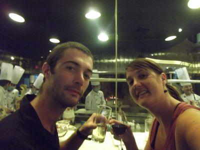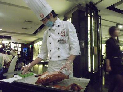 | Le serveur decoupe le canard laque devant nous. Il sait s y prendre. Apres on deguste ca avec plein de petits legumes differents. C etait tres bon et pas cher (meme si la bouteille de Bordeaux nous a coute plus cher que le canard!) |