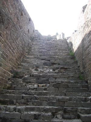| Comme on a pas choisi la partie la plus touristique, la muraille n'est pas restauree et par endroit ca monte dur et il faut etre prudent. On a marche sur la muraille pendant deux bonnes heures, c'etait genial. |