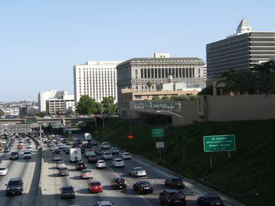 | Los Angeles, c est plein de petits quartiers colles les uns au autre. Le long de la grande avenue, il y a des immeubles recents qui forment le quartier des affaires. |