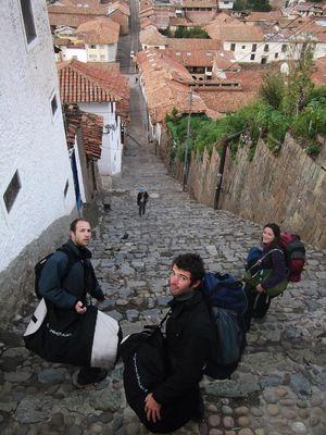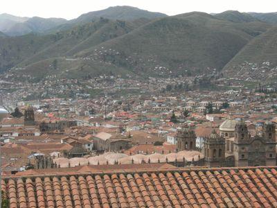 | Cusco c est aussi une ville qui est loin d etre plate! Le centre ville est en bas mais les hotels sont souvents plus hauts sur les montagnes. On devait donc se monter des rues bien en pente afin d arriver a notre hotel. A 3400m d altitude autant dire que la montee etait pas facile et que l on "buffait" bien comme on dit en Charente. Enfin, arrives en haut la vue etait magnifique. |