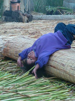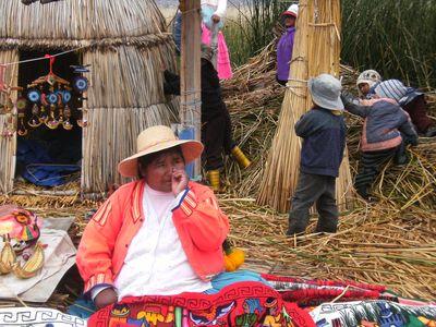 | Les iles les plus proches de Puno sont des iles artificielles construites avec des roseaux. L ambiance aussi est artificielle, les bateaux de touriste se succedent avec toujours les meme rituels. C est tout de meme interessant de voir comment les gens y vivent. |