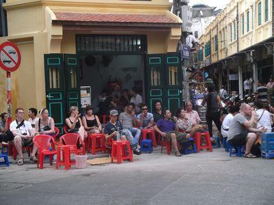 | Mais Hanoi c est aussi une ambiance tres sympa. On peut boire des bieres et deguster les produits locaux sur des petites terrasses improvisees sur les trottoirs avec des tabourets en plastique. La "Bia Hoi" est a 5000 dongs (soit 20 centimes d'euros) le verre! Ce qui nous a permis de bien nous empreigner du coup de cette biere brassee! |