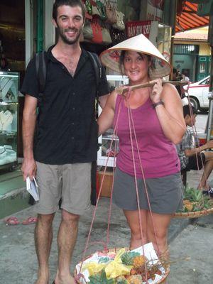 | On se fait aussi interpeler par les femmes qui vendent des fruits dans la rues. Elle transportent les fruits dans deux paniers en equilibre sur une epaule. Comme vous pouvez le voir je suis deguisee en vendeuse de fruits Vietnamienne avec le typique chapeau conique! |