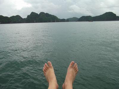 | En rentrant de ma session escalade sur les riches karstiques de le baie d'Along, j'ai ete ramene par une sorte de petite barque a moteur. Le chauffeur m'a meme laisser le diriger (et non on ne sait pas cracher sur un rocher). C'etait un moment tres sympa. Le paysage etait magnifique. A l'arrivee sur le port c'est un chauffeur en scooter qui ma ramene jusqu a l'hotel (sans casque bien sur..!) |