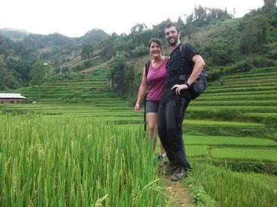 | Le lendemain nous voila donc partis pour une randonnee dans les rizieres avec notre guide "Sa". Le vert des rizieres est impressionnant tellement il est vif! On a eu une belle journee sans pluie pour cette randonnee. Une vrai chance en pleine saison des pluies! |