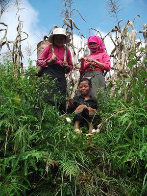 | Les femmes Hmong ramenant le mais. Les hommes eux s'occupent de recuprer les epis a l aide de buffles et de chevaux. Les gens travaillent dur et dans des conditions difficiles. Mais comme nous explique "Sa" : " Bien travailler, bien manger. Pas travailler, pas manger". Ici c'est simple tout le monde travaille de 7 a 77 ans voir plus et personne ne se plaind. C'est une vrai richesse pour nous de rencontrer ces tribus et ...ca fait reflechir!... Sa nous explique aussi que les couples font beaucoup d'enfants pour que leurs enfants puissent s'occuper d'eux une fois qu ils seront vieux. Malheureusement, certaines familles "choisissent" davoir des garcons car les filles partent se marier et vivre avec la belle famille. C'est surprenant de voir encore ce genre de pratique de nos jours... |