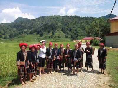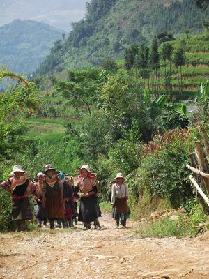 | Nenette parait tres grande au milieu des femmes Zao. Ici, rien a voir avec Bac Ha, les ethnies vivent du riz mais aussi du tourisme. Elles savent s y prendre pour vous vendre des souvenirs. |