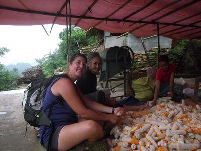 | Le deuxieme jour, nous sommes repartis en direction de Bac Ha. La pluie etait tombee toute la nuit et cela nous a oblige a suivre la route plutot que les petits chemins de montagne qui etaient trop boueux. On s'est arrete dans une famille Hmong qui egrenait du mais on leur a donc donner un petit coup de main. Le grand pere de la famille etait tres connu dans le village car il avait 70 ans et avait fait la guerre contre les americains. Il nous a acceulli a sa table et nous a offert quelques verres d'alcool de mais. La encore ca ne se refuse pas, meme si il est 9h du matin et que son alcool doit frise les 40%! On est repartis tres joyeux de cette maison! |