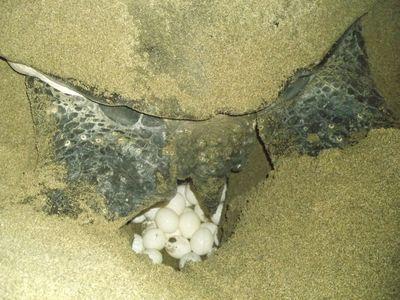 | Et bien la voila en train de pondre 148 oeufs! Rien que ca! C'est tres impressionnant a voir. Le monsieur qui s occupe des tortues du parc, lui pique les oeufs pour les faire eclore a l abri des predateurs. Ensuite elle rebouche le trou qu elle a fait pour ces oeufs et repart lentement vers la mer. ca va pas vite ces choses la (150 kg rempant sur le sable, il faut se les trainer!) |