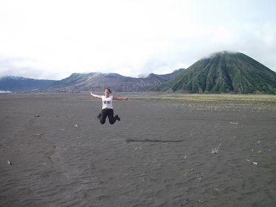 | Apres avoir monter une montagne pour voir le lever de soleil sur les volcans, qu on a pas vu. On est parti monter le volcan Bromo. Vous pouvez voir comme je suis contente de marcher dans un enorme cratere et de me faire une deuxieme ascension a 7h du mat!