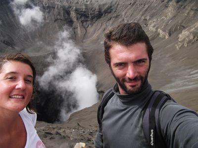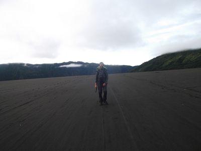 | Le lendemain matin, comme on en avait pas eu assez on est parti voir de plus pres le mont Semeru. On s'est donc fait une rando dans l enorme cratere pour rejoindre le volcan le plus haut de l ile. Apres 5h de marche, on a decide de ne pas monter le mont Semeru (une ascension de 3 jours et deux nuits sous tente) On etait pas assez equipe pour monter et il n y avait pas d equipe d encadrement serieuse capable de nous aider... Comme on a lu sur le guide que des voyageurs sont morts de froid en montant, on a pas tente... Il faut dire qu il a beau faire chaud en Indonesie a 3700m d altitude, c'est pas pareil...
