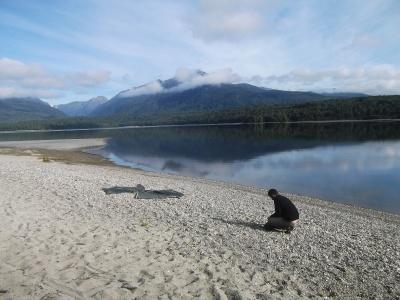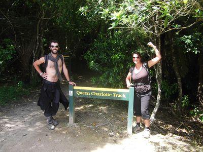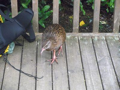 | Le premier jour nous avions 27 km a faire. On avait pris nos gros sacs a dos et il pleuvait. Ca a ete dur dur... On a quand meme vu de belles forets et des "Weka" cet oiseau qui ne vole pas et qui ressemble au "Kiwi". C'est pas du tout peureux et ca aime bien piquer la bouffe du pic nic! |