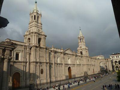 | Apres le Machu Picchu et le lac Titicaca, on est descendu des hauts plateaux pour rejoindre Arequipa une ville du cote Ouest du Pays. La ville est classee au Patrimoine Mondial notamment pour sa place et sa belle cathedrale blanche. |