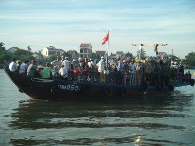 | Apres deux jours a Hoi An, nous sommes partis pour la petite ile de Cham qui se trouve a 20 km de Hoi An. Sur notre guide il etait ecrit : une ile authentique, pas touristique, ideale pour faire de la plongee. Ca nous a donc bien tente et on s'est leve a 6h du matin pour prendre le seul bateau qui relie l ile une fois par jour. Sur la photo vous voyez un bateau typique de Hoi An qui amene les gens des villages aux alentours pour le travail et l'ecole. Le bateau est plein a craque, charge de scooters, velos et villageois. |