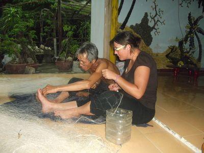 | Nous avons ensuite eu droit a un cours de reparation de filet. J ai eu beau essaye de m atteler serieusement a la tache je n arrivait pas a reparer ce filet avec la meme dexterite que le pere de famille. D'ailleurs ca le faisait bien rire! |