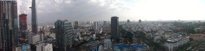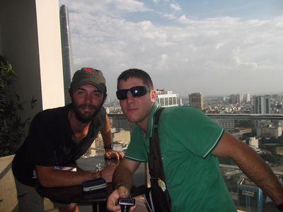 | Comme je vous disais Baptiste est arrive. Il a pas trop change, il parle toujours autant. La on se boit un petit cocktail avec vue sur Saigon. |