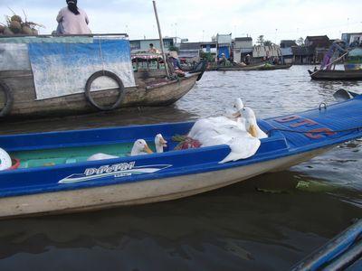 | Le marche flottant, c'est comme un marche Vietnamien normal mais sur l'eau. Tot le matin on voit donc des petites barques deambuler sur l'eau a la recherche de fruits, de legumes et meme de volailles. |