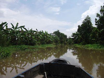 | On a ensuite ete se perdre dans les petits canaux du Mekong. Vous pouvez voir les deux frangins qui ont l'air bien heureux tous les deux (C'est pour moi que c'est difficile maintenant : je n'ai plus mon mot a dire face aux frangins!...). Vous pouvez voir ue notre guide est debout a l arriere en train de piloter. A c'est sur elle s'est plus jamais rassis apres le choc avec l autre bateau! Bon mais elle regarde pas droit devant quand meme : c'etait pas une grande experte nautique! |