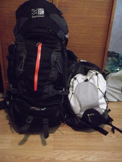 | A 8 jours du départ, premier test du sac à dos. Et... Bonne nouvelle : ça loge (comme diraient les charentais)! Le gros sac pèse 14,4kg et le petit 3,4kg, sachant que j'ai tout mis dedans et qu'il y a certaines choses que je porterai directement sur moi (Chaussures de marche, ...). C'est donc un bon résultat! Il reste deux, trois bricoles à acheter et à ajuster mais les choses s'annoncent bien!