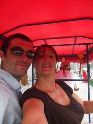 | Le lendemain on est partis visiter le palais d'ete de Pekin. Nous avons bien sur fait les "vrais" touristes et pris un pousse pousse pour nous y rendre (il faut dire qu il pleuvait des cordes et que ca nous arrangeait bien!). Bon, le pousse pousse aujourd'hui ca a bien change! Le conducteur n est plus a pieds mais en velo et meme en velo electrique voir en mobilette : c'est plus si difficile d'etre conducteur de pousse pousse en Chine. |