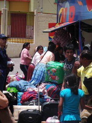 | Dans notre bus pour Cusco, comme dans les villages, les peruviennes et les peruviens sont tres souvent habilles en habits traditionel. La vous voyez des femmmes avec leurs longues tresses et les habits colores remplirent la soute a bagages. Elle emmenent des objets artisanaux confectionnes a la main a Cusco pour les vendre aux touristes. Le plus marrant c est que 10 minutes apres avoir charge le bus, on s est fait arrete par la douane et on a du revider le bus. Il faut etre patient, les douaniers ne rigolent pas ! |