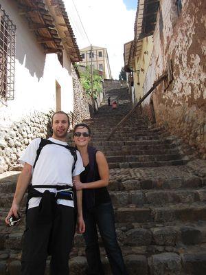 | Cusco c est aussi une ville qui est loin d etre plate! Le centre ville est en bas mais les hotels sont souvents plus hauts sur les montagnes. On devait donc se monter des rues bien en pente afin d arriver a notre hotel. A 3400m d altitude autant dire que la montee etait pas facile et que l on "buffait" bien comme on dit en Charente. Enfin, arrives en haut la vue etait magnifique. |
