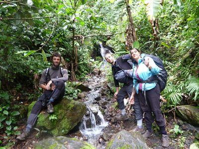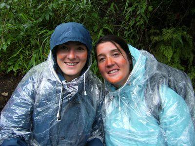 | Le lendemain matin on s est pares pour une journee de marche. Apres avoir enfiles nos ponchos (Et oui la pluie avait fait son apparition pendant la nuit) et colores nos visages avec de la peinture extraite de plantes ecrassees, c etait partit pour une journee de rando! |