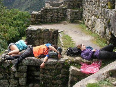 | Le reconfort! Apres avoir "supportes" notre visite guidee, rien de tel qu une petite sieste dans un recoin du Machu Picchu. Apres s etre levé a 4h du mat, se reposer sur le site d une des plus belle merveilles du monde, c est le pied! Bon bien sur, il faut se trouver un endroit tranquille car dormir au Machu Picchu s est interdit! Et oui! Mais le site est tellement grand qu on trouve facilement un petit coin isolé! |