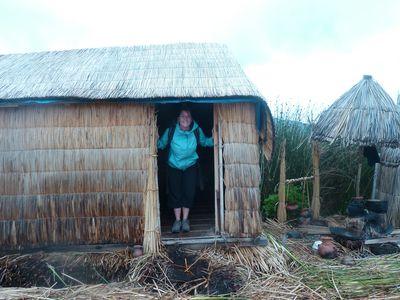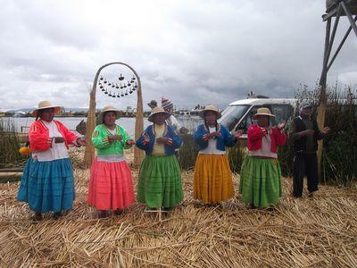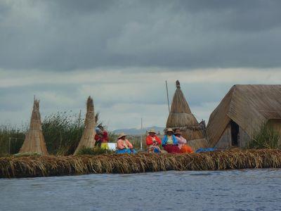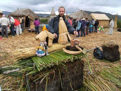 | Les iles les plus proches de Puno sont des iles artificielles construites avec des roseaux. L ambiance aussi est artificielle, les bateaux de touriste se succedent avec toujours les meme rituels. C est tout de meme interessant de voir comment les gens y vivent. |