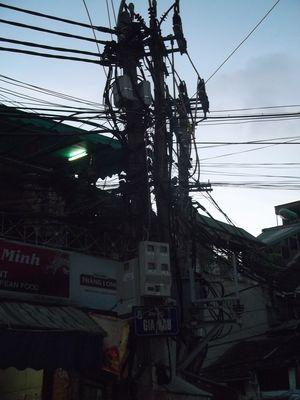 | Baptiste, on se demandait ce que tu penserais des installations electriques a Hanoi? Dur de s'y retrouver non? Et c'est comme ca a chaque coin de rues! |