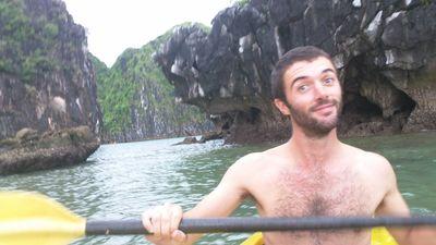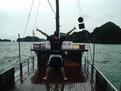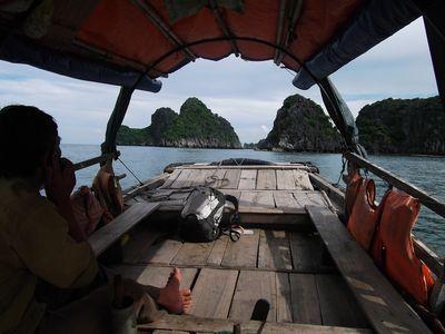 | En rentrant de ma session escalade sur les riches karstiques de le baie d'Along, j'ai ete ramene par une sorte de petite barque a moteur. Le chauffeur m'a meme laisser le diriger (et non on ne sait pas cracher sur un rocher). C'etait un moment tres sympa. Le paysage etait magnifique. A l'arrivee sur le port c'est un chauffeur en scooter qui ma ramene jusqu a l'hotel (sans casque bien sur..!) |