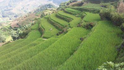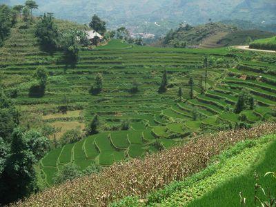 | Une petite photo des rizieres en plateaux. Le riz est presque bon pour la recolte. Du coup on a eu la chance de voir des champs avec les plans de riz assez hauts et tres verts. Le systeme d irrigation d'etages en etages est tres au point. |