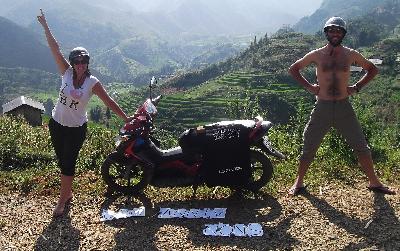 | Le premier jour a Bac Ha a ete consacre a l'organisation d'une randonnee de 2 jours dans les montagnes avec un guide, a la recuperation de la nuit dans le bus et a une petite balade en scooter! Quel plaisir de parcourir les routes de montagnes en "Scoot" (comme a notre adolescence!) et d'admirer le superbe paysage. |