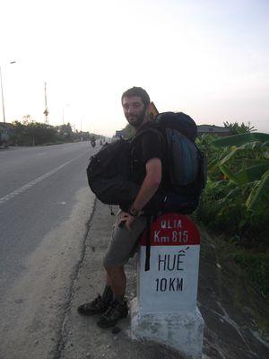 | Apres notre escapade dans le nord, nous sommes partis pour le centre. Apres quelques heures de bus (11h de nuit avec un chauffeur qui s enervait sur son klaxon), nous sommes arrives dans la ville de Hue. enfin presque... Le bus nous a depose a 4h30 du matin a 13km de Hue (merci a mes anciens collegues pour le GPS, ca aide bien quand on est completement paume!). Il y avait bien des chauffeurs de scooters qui voulaient nous emmner a Hue mais nous avons refuse car la stabilite sur un scoot avec deux enormes sacs c'est pas top. On a donc decide de se faire une petite marche matinale vers Hue, comme deux vieux routards. Au bout d'une dizaine de kilometres, un cubain en voiture a eu pitie de nous et nous a fait parcourir les derniers kilometres dans son 4X4 climatise! (que du bonheur apres une telle marche!) |